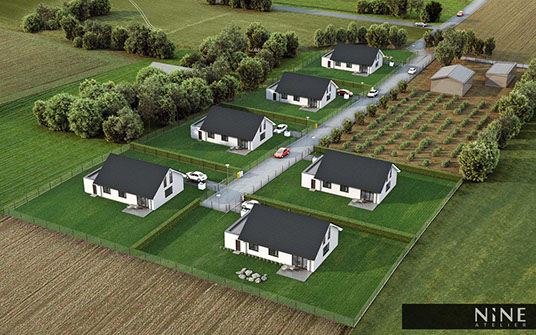 Wizualizacje osiedla składającego się z sześciu domów jednorodzinnych jednolokalowych w zabudowie wolnostojącej w Myśliborzu.