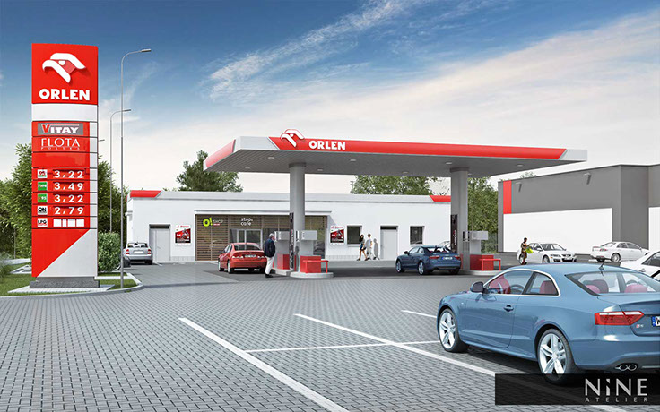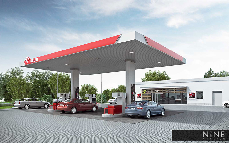 Stacja paliw została zaprojektowana zgodnie z wytycznymi operatora- firmy Orlen. Przewidziano sześć miejsc z dystrybutorami do tankowania samochodów osobowych, miejsce z kompresorem i odkurzaczem oraz budynkiem handlowym, gdzie przewidziano również sklep sieciowy Orlen O! Shop wraz z stop. cafe.