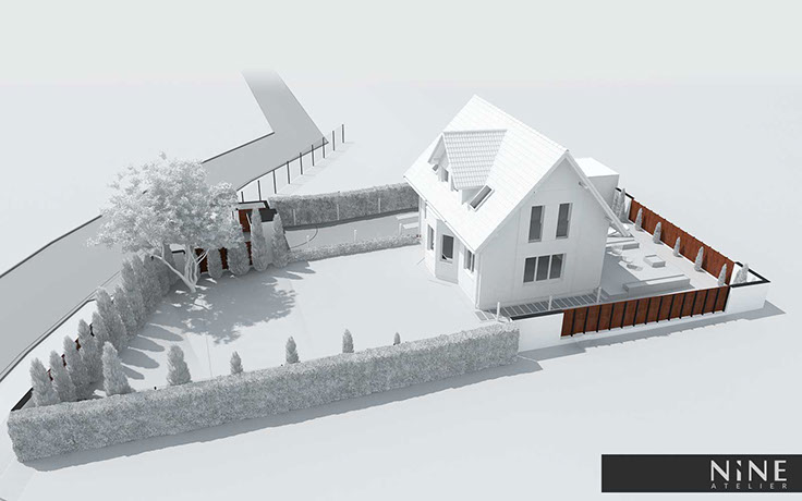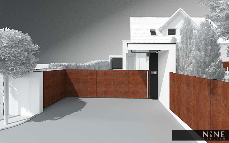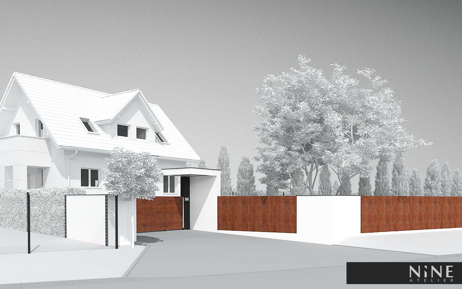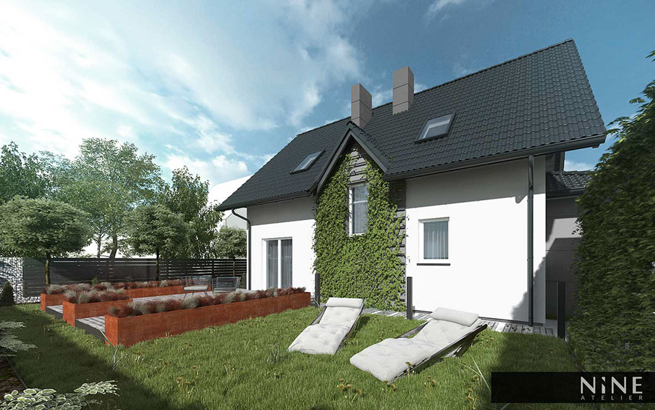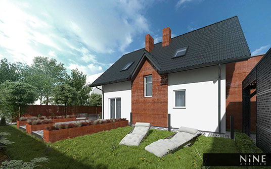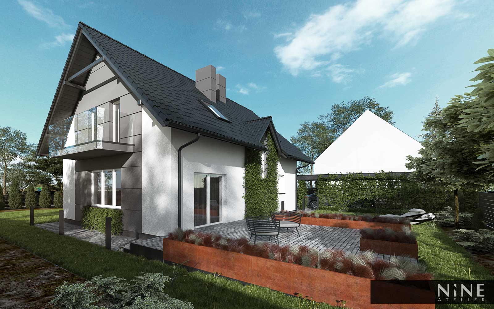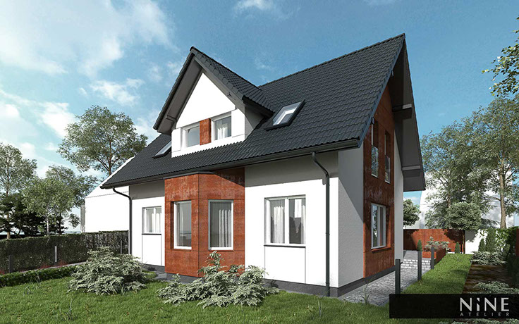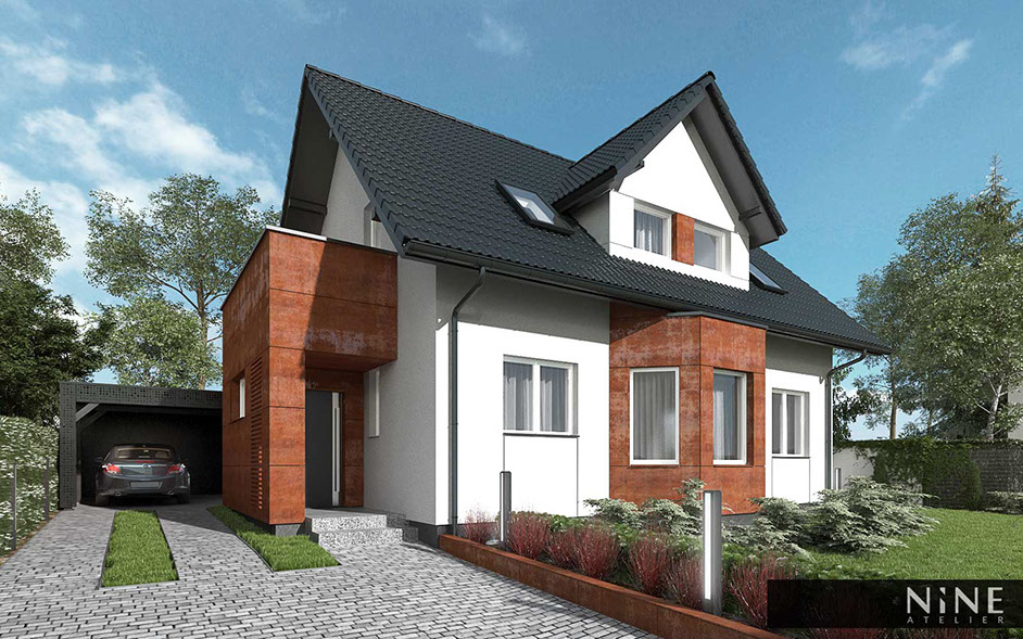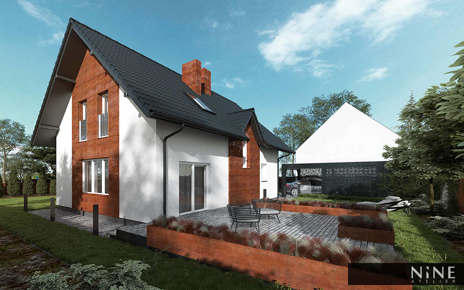 Wersja ta przewiduje zmianę dachu nad wejściem na stropodach płaski, zmianę konstrukcji dachu nad balkonem frontowym wraz z jego zabudową, rozbiórkę balkonu bocznego z zastąpieniem go balustradą szklaną w oknach typu portfenetre. Koncepcja zakłada dopełnienie geometrycznych kształtów wraz z uzupełnieniem ich i podkreśleniem poprzez zastosowane materiały elewacyjne. Najważniejszym z nich jest blacha ze stali corten, która ulega naturalnemu i równomiernemu utlenianiu żelaza- rdzewieniu. Dzięki zestawieniu nowoczesnej, rdzawej w kolorze stali kortenowskiej z gładkim białym tynkiem elewacyjnym Ceresit uzyskano efekt nowoczesnej, prostej i atrakcyjnej w odbiorze szlachetnej elewacji. Z tego samego materiału zaprojektowano charakterystyczne i geometryczne w formie ogrodzenie złożone z płotu, bramy, zadaszonej furtki wejściowej z domofonem oraz zabudowy śmietnika.