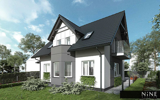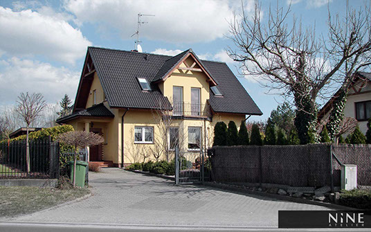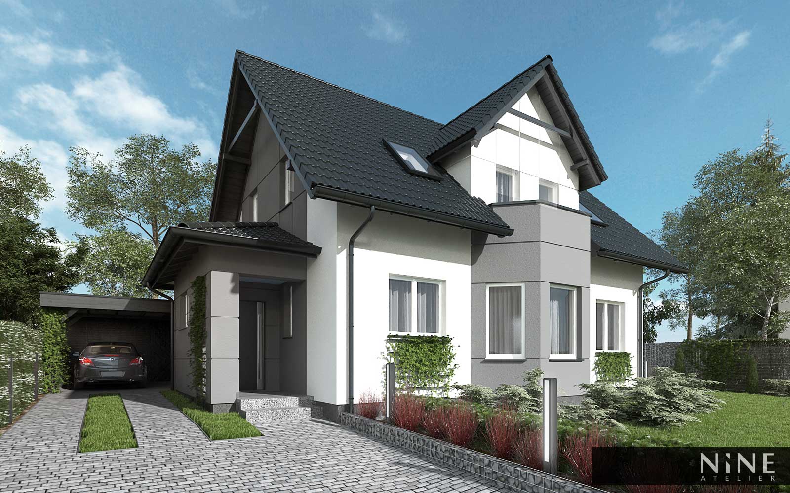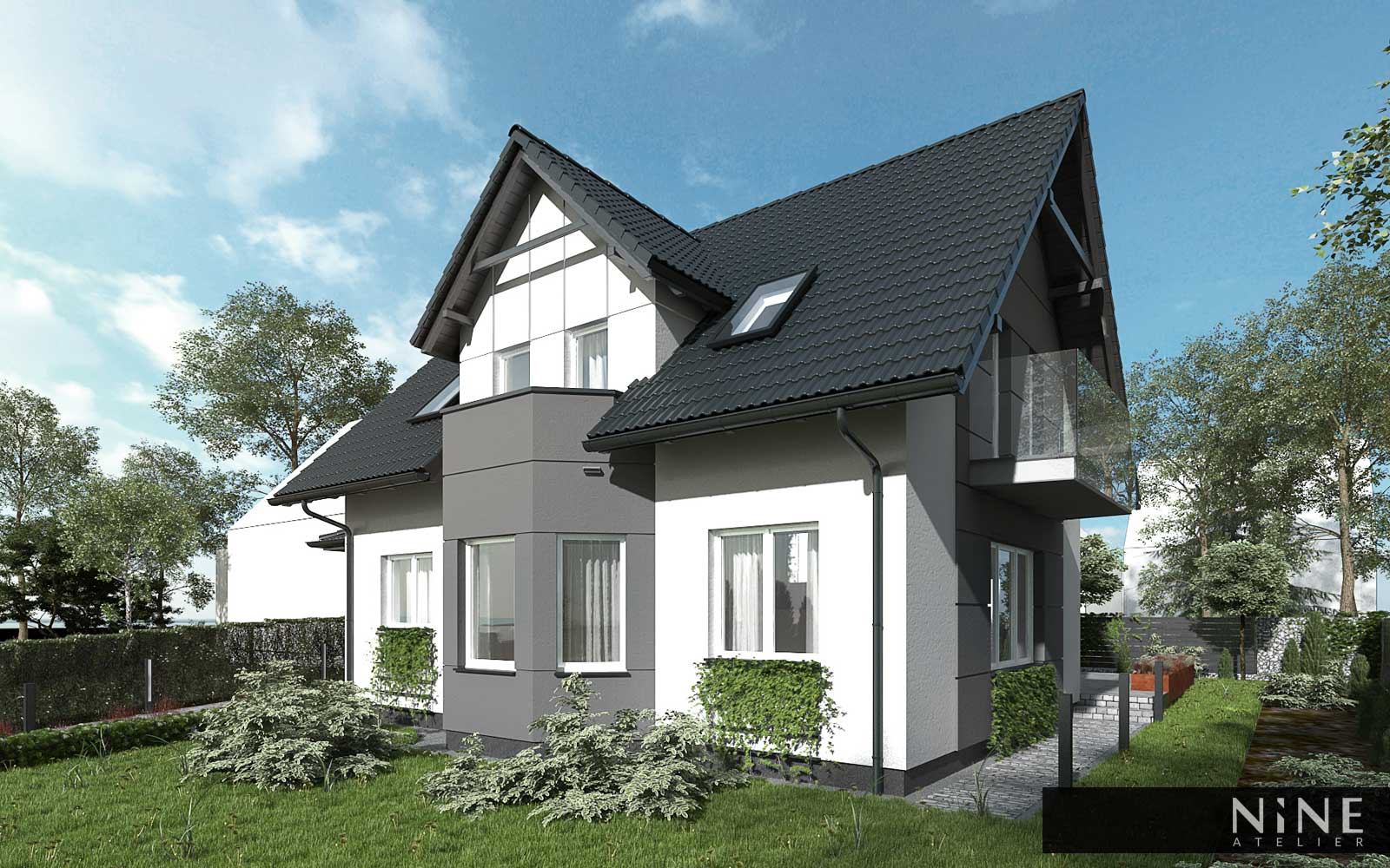 Projekt modernizacji elewacji domu jednorodzinnego, który wybudowany został na przełomie lat 2007-2008 przygotowano zgodnie z życzeniem inwestora w dwóch wersjach kolorystycznych i materiałowych.