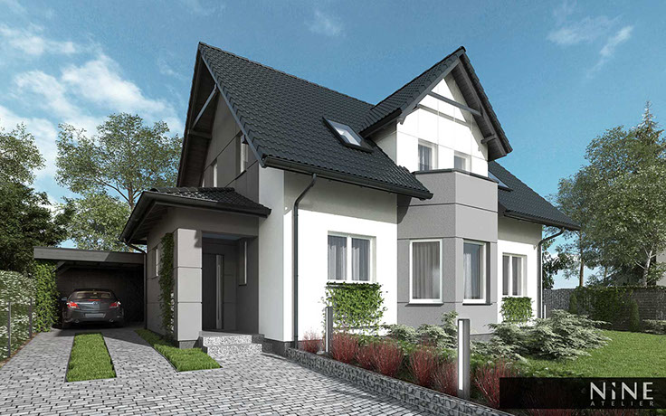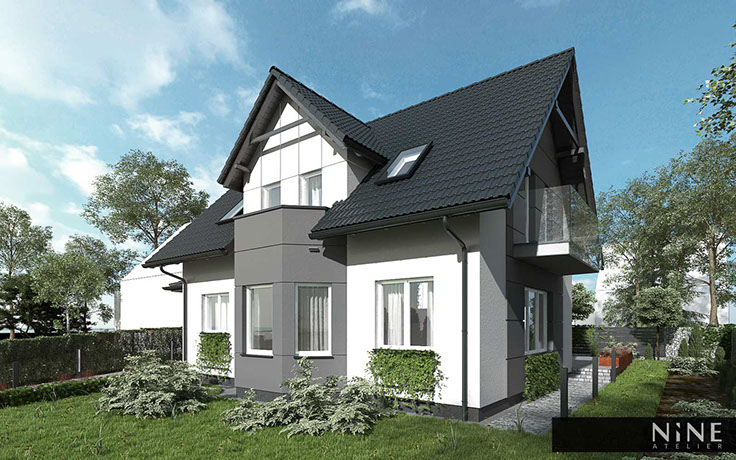 Kolorystykę elewacji zaproponowano jako zachowawczą i wpisującą się kolorystykę okolicznych domów. Dominującym kolorem jest biały, uzupełniony popielatym oraz tynkiem mozaikowym Ceresit na cokole w kolorze ciemno popielatym.