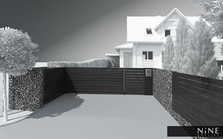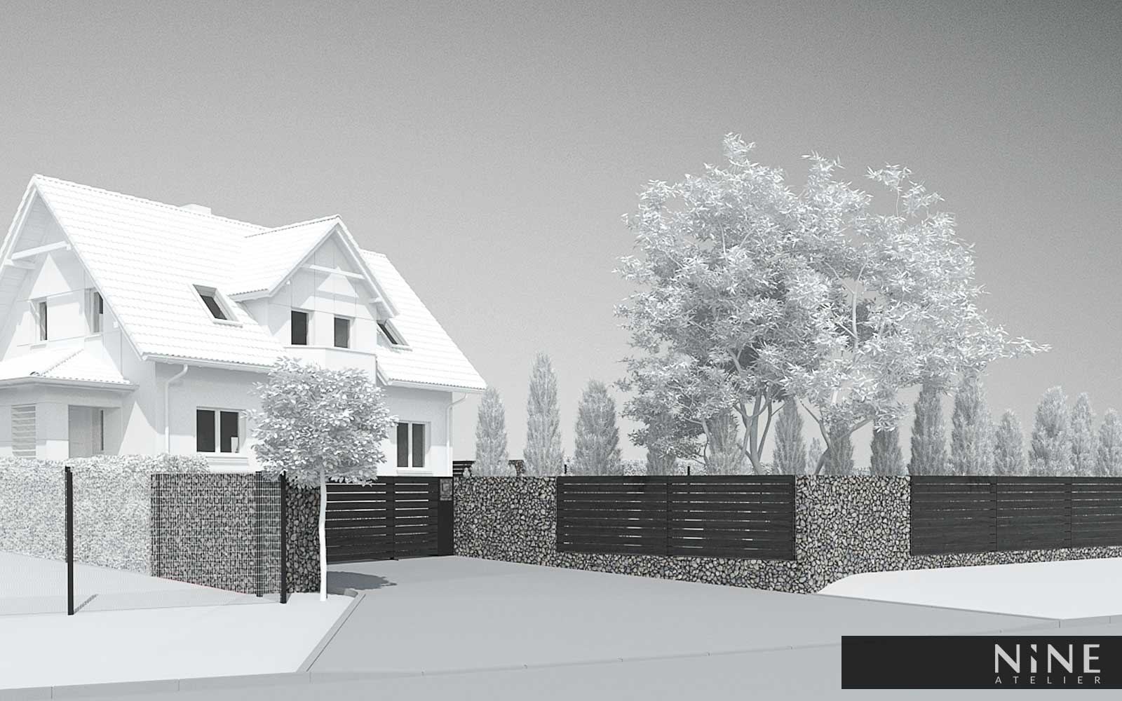 Ogrodzenie wraz z bramą zaprojektowano w podobnej kolorystyce - szarości, którą przewidziano z kamiennych gabionów oraz desek aluminiowych, okleinowanych w kolorze ciemno szarym.