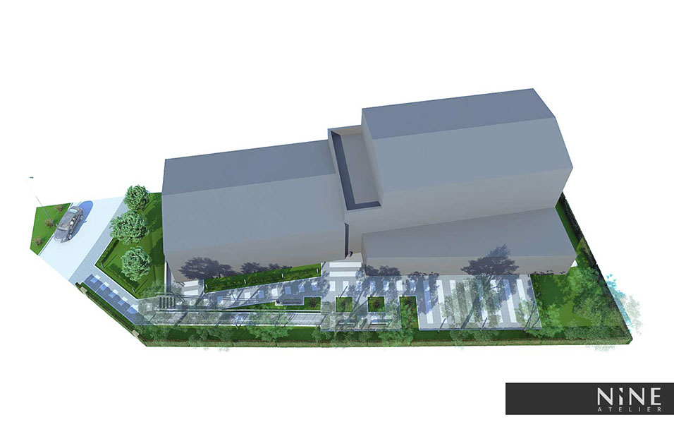 Jako uzupełnienie projektu wnętrz zlecono nam zaprojektowanie przestrzeni przed rozbudowywanym budynkiem, gdzie przewidzieliśmy schody z pochylnią dla niepełnosprawnych, taras eventowy, miejsca odpoczynku dla klientów oraz nasadzenia zielenią niską.